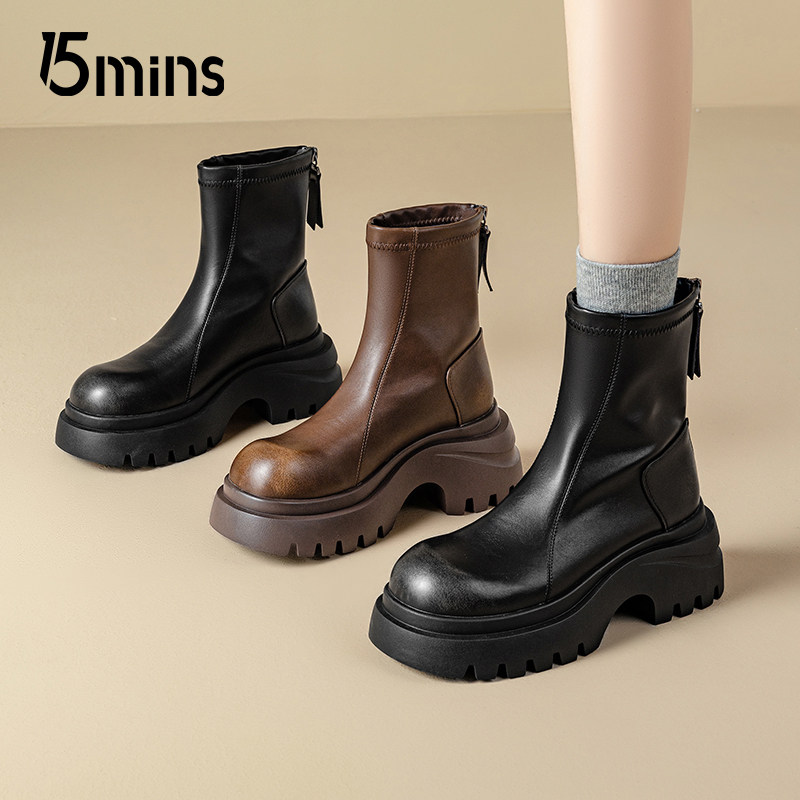 15mins黑色切尔西靴女2025新款秋季增高短靴子厚底中筒百搭马丁靴