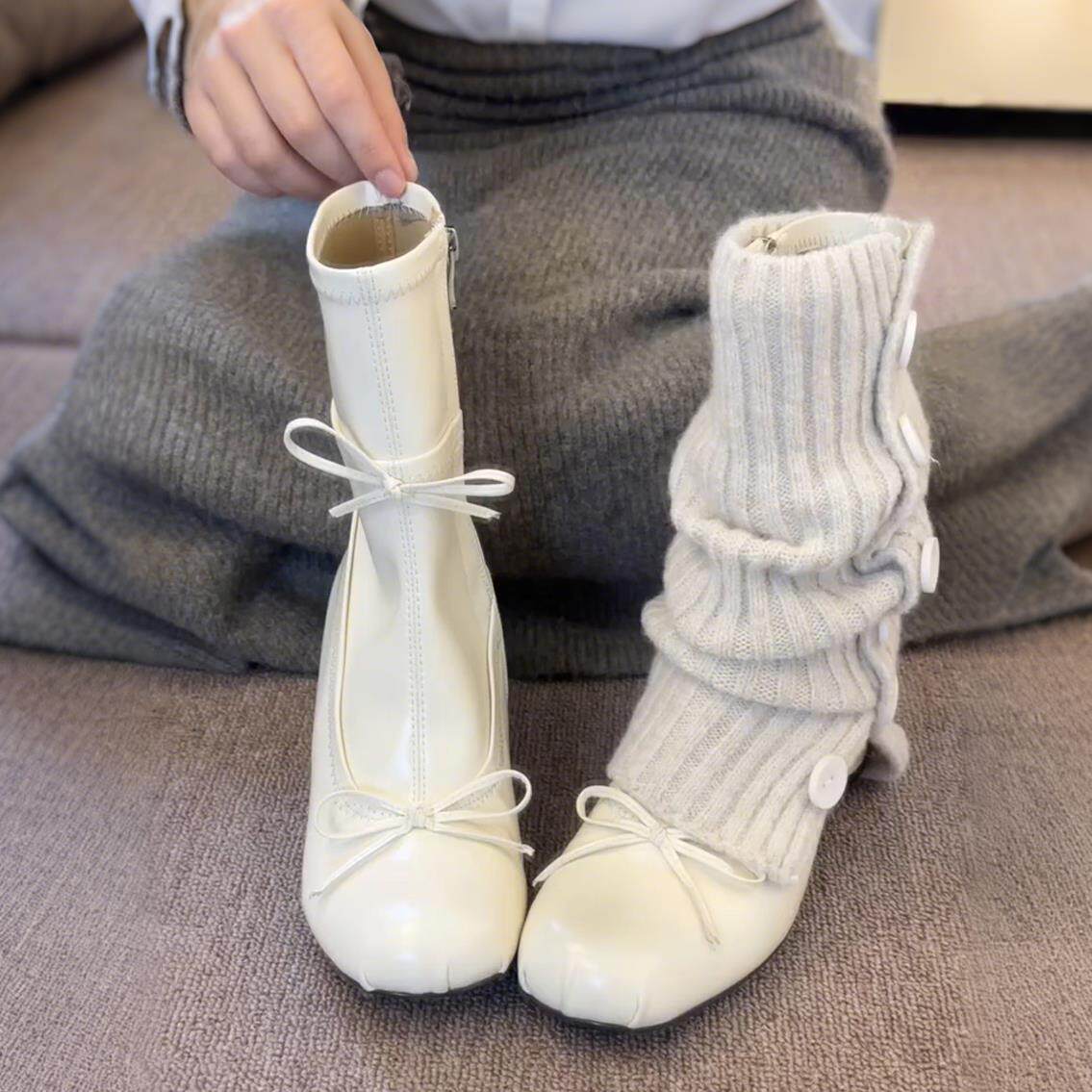 法式芭蕾风蝴蝶结粗跟瘦瘦靴女2025秋季新款百搭增高侧拉链短靴子