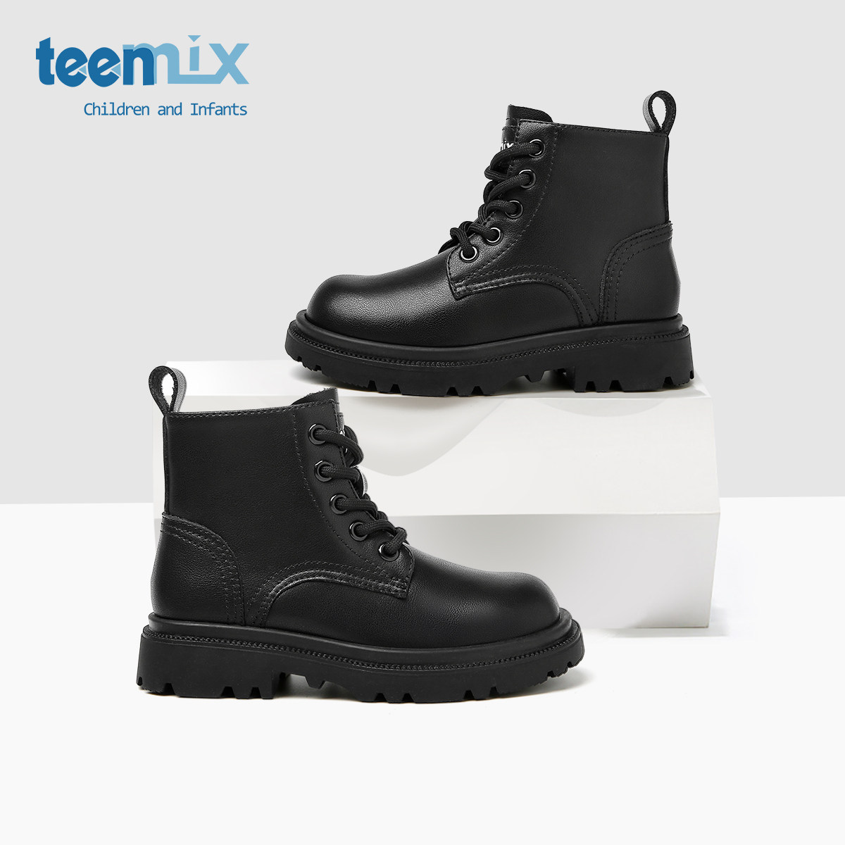 天美意童鞋2025年秋季新款女童简约百搭靴子男童马丁靴黑色小短靴