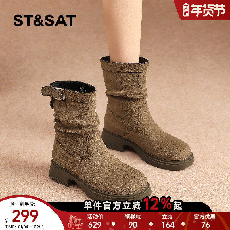 星期六真皮短靴女2025新款秋季粗跟马丁靴时尚百搭高跟鞋瘦瘦靴子