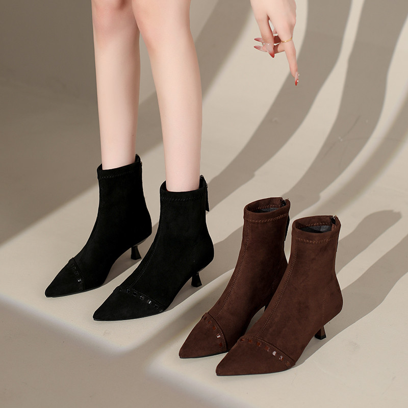 【TFM】短靴女2025秋季新款复古绒面百搭细跟尖头后拉链瘦瘦靴子