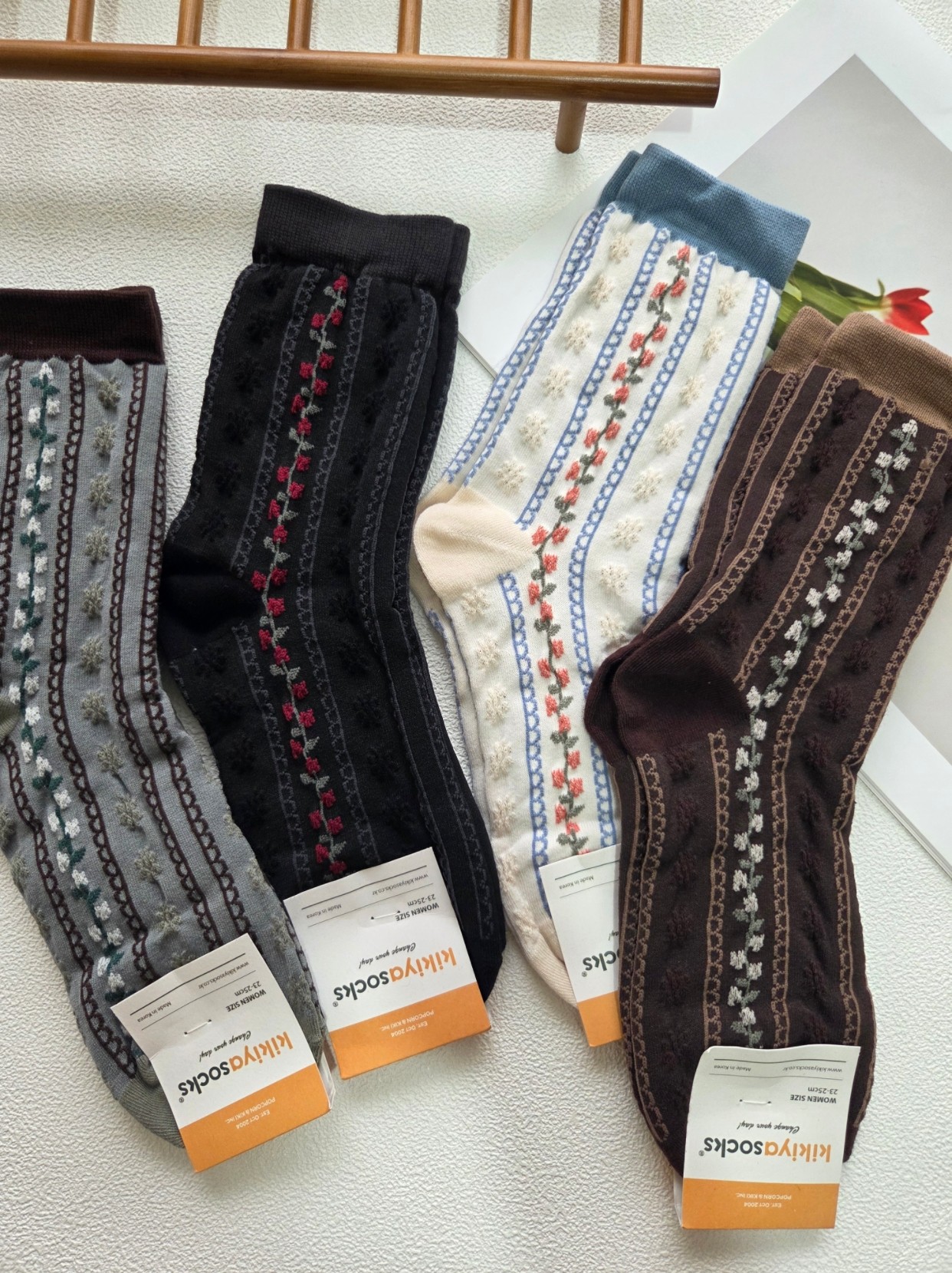 韩国袜子东大门秋冬新品百搭日系复古花朵森女棉袜ins网红中筒袜