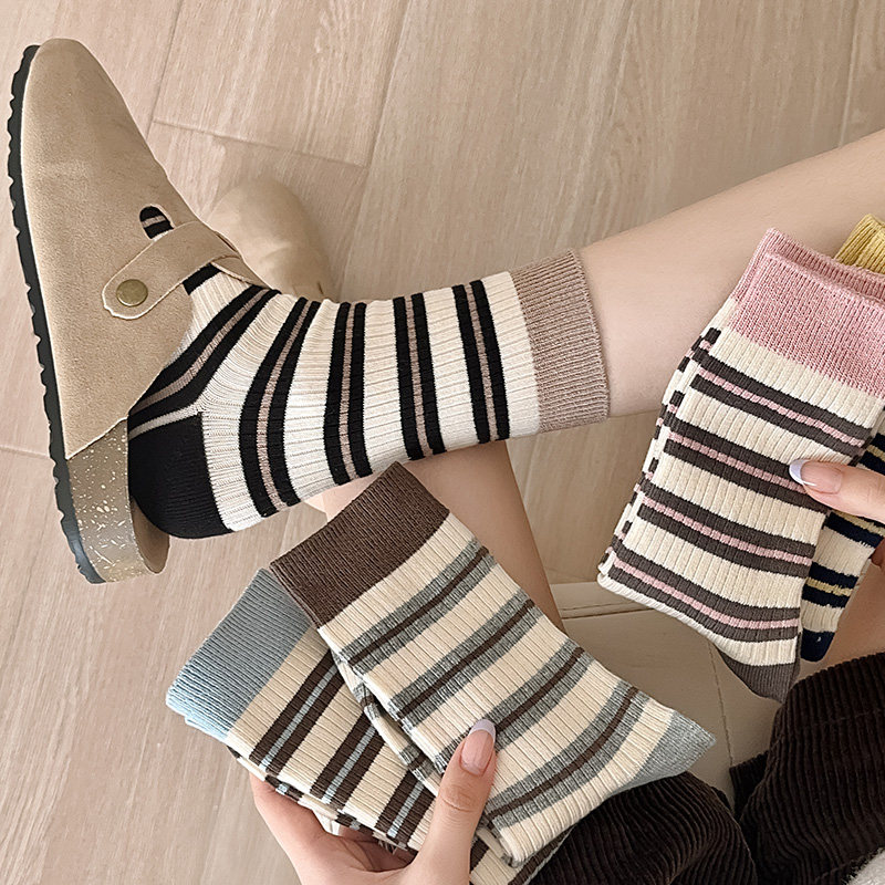 韩国女袜东大门秋季新款网红款拼色竖条纹针织弹力袜子百搭中筒袜