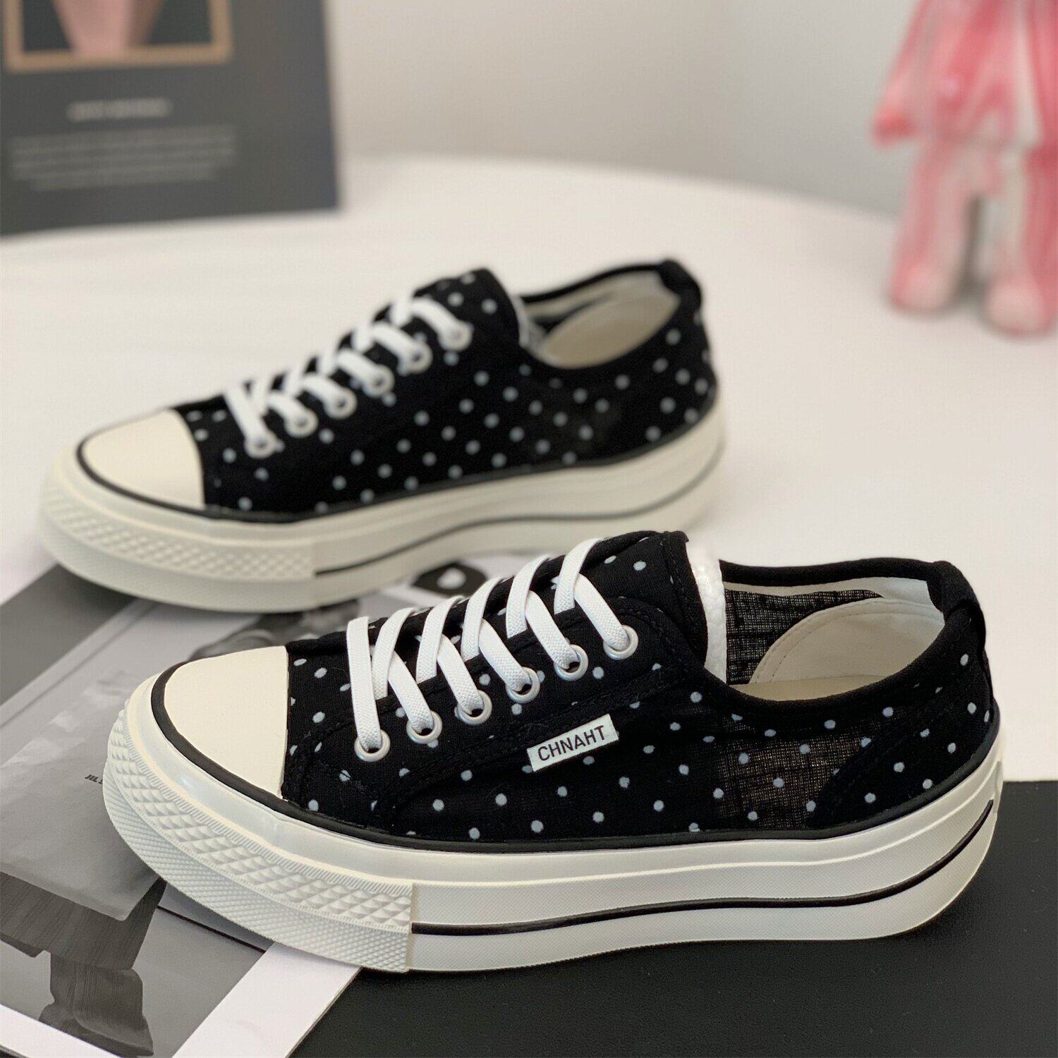 韩版波点厚底舒适休闲板鞋女2026年夏季透气网学生系带超火小白鞋