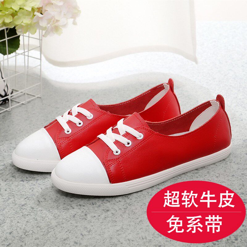 小白鞋女秋真皮系带韩版透气学生板鞋一脚蹬平底单鞋圆头浅口女鞋