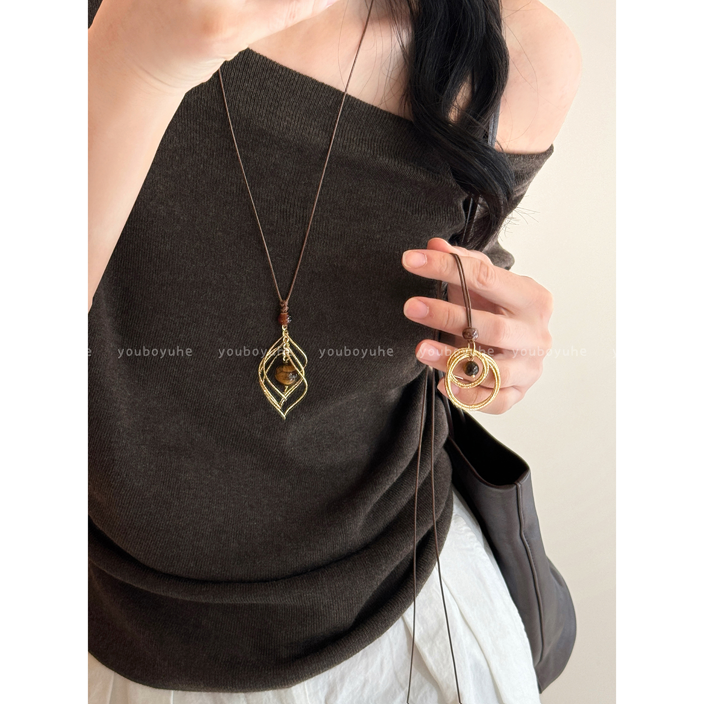 美拉德金色虎眼石长款吊坠项链女款轻奢高级感毛衣链复古装饰配饰