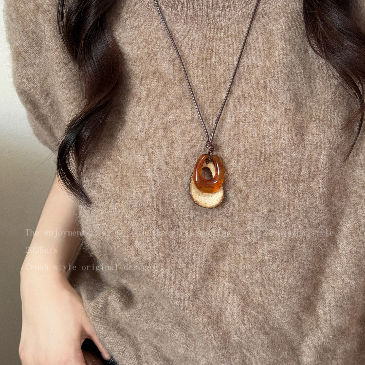 咖色木质椭圆环吊坠项链女款秋冬复古装饰毛衣链高级感长款配饰品