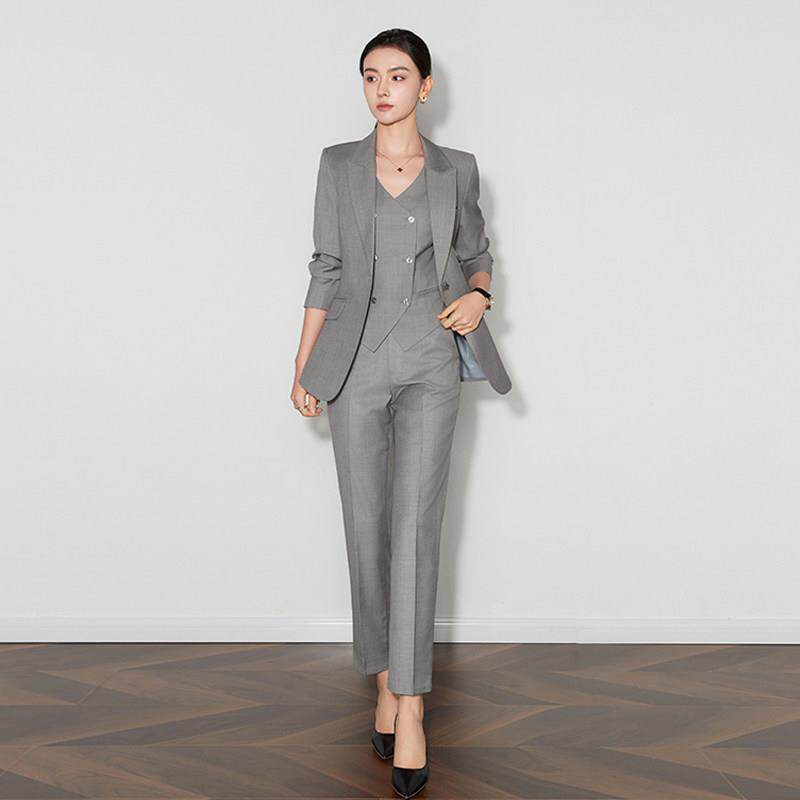2025秋冬新款职业正装西装套装女精纺羊毛灰色工作装马甲三件套女