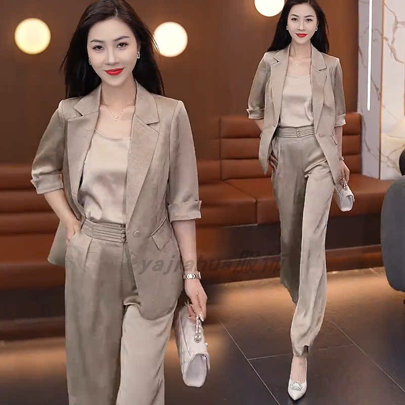 显瘦高级感冰丝缎面西装套装女2024夏季新款气质三件套职业装正装