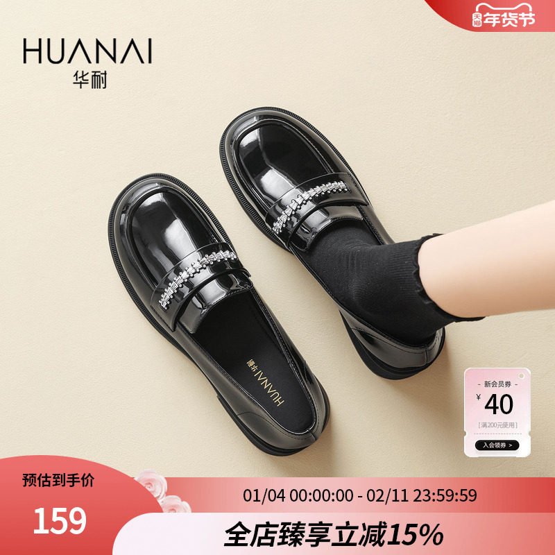 华耐黑色乐福鞋女2026新款春季一脚蹬亮面单鞋粗跟英伦风小皮鞋子