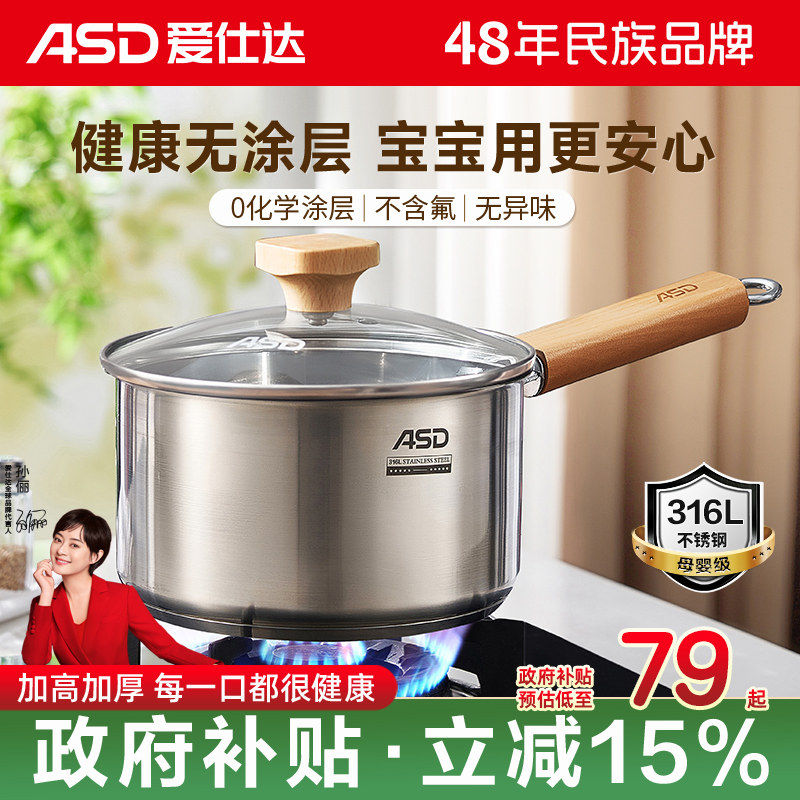 爱仕达316L无涂层不锈钢辅食锅奶锅宝宝婴儿专用热奶煮面泡面小锅