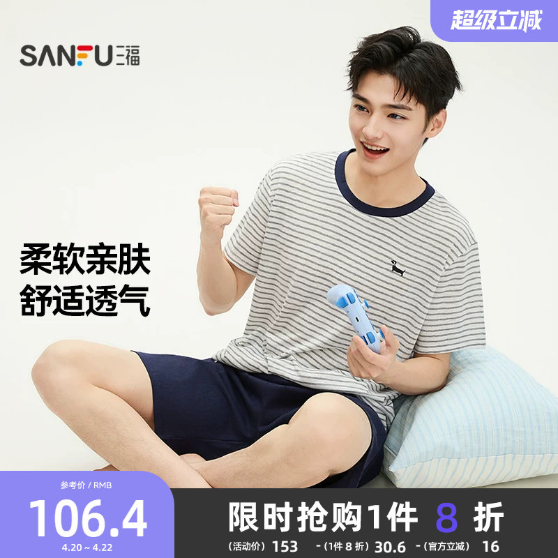 三福男款家居服春夏季条纹刺绣睡衣套装趣味宽松休闲短袖居家服男