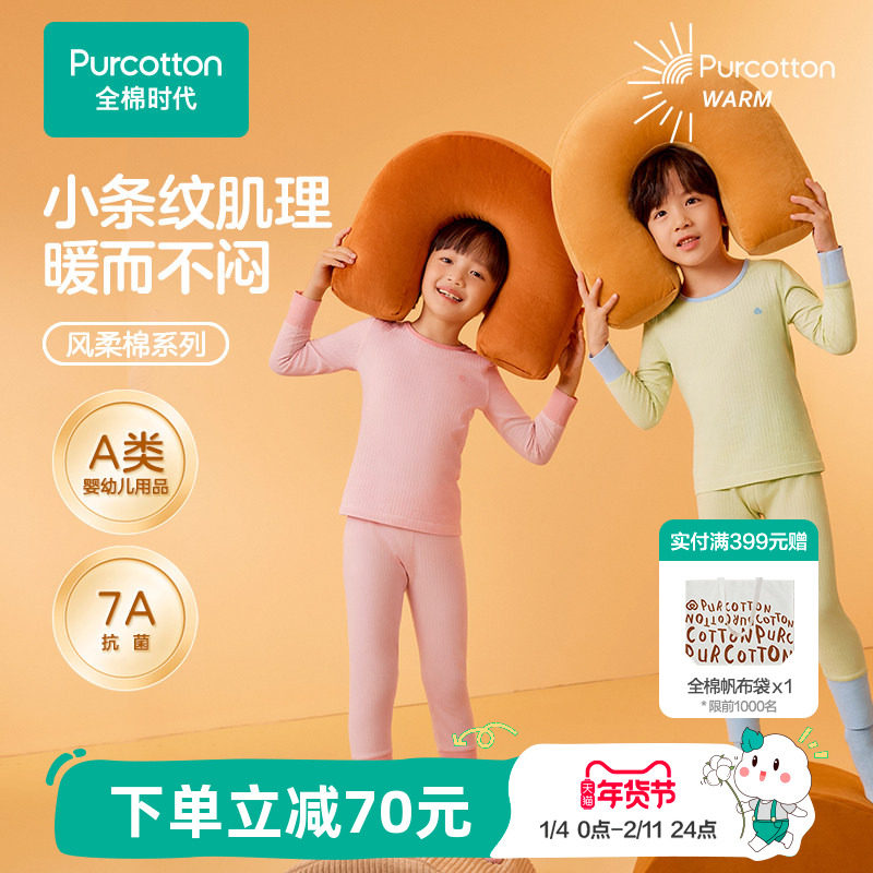 全棉时代儿童风柔棉抗菌保暖内衣男女孩宝宝秋衣秋裤纯棉睡裤套装