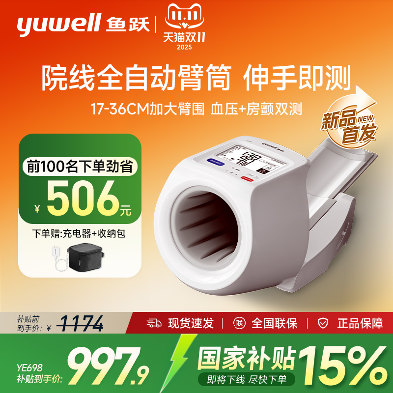 【新品】鱼跃臂筒式血压计电子血压测量仪高精准医院老人家用正品
