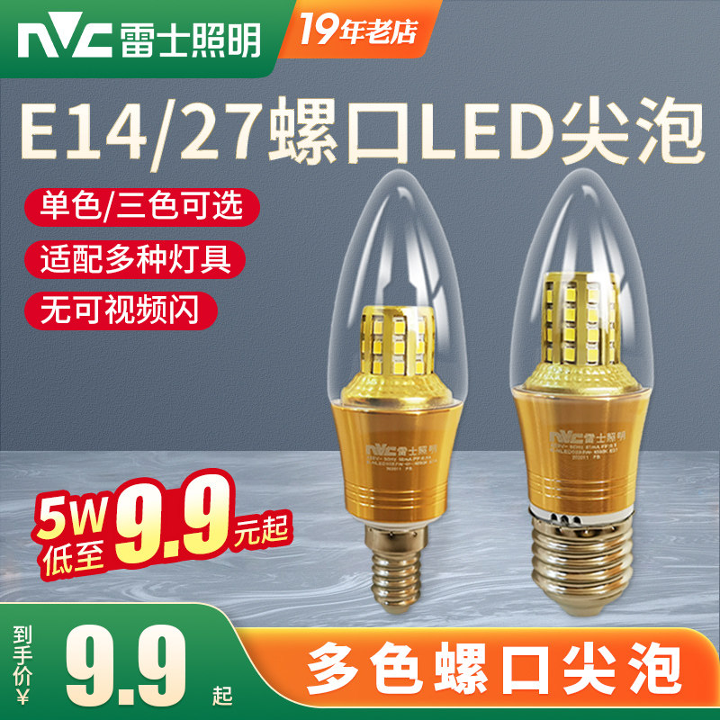 雷士照明led灯泡e14三色5W7W9W节能家用吊灯光源大小螺口e27尖泡