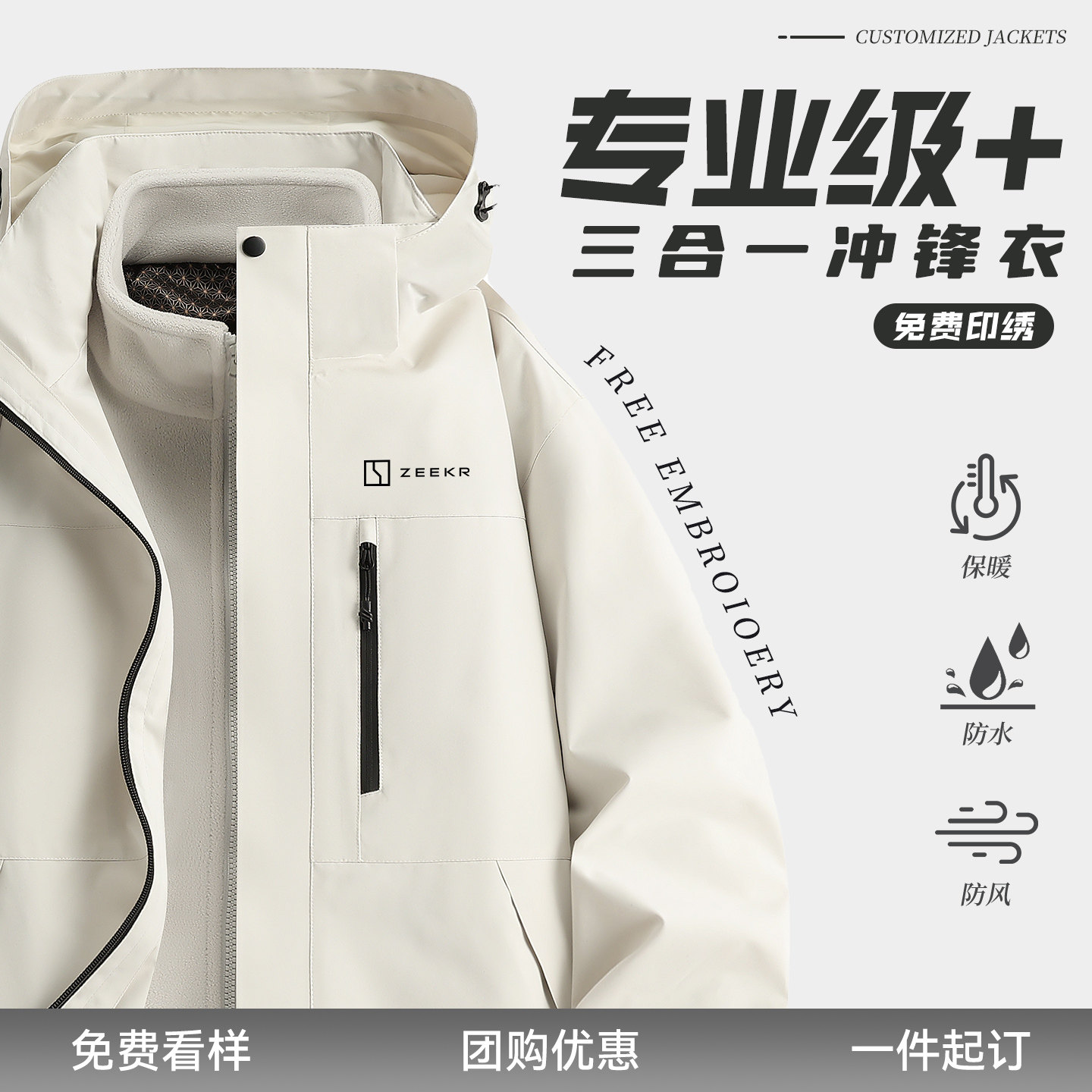 高端户外冲锋衣定制logo三合一工作服外套印字羽绒工装刺绣可拆卸