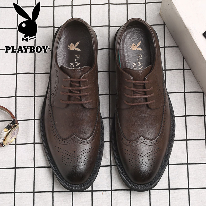 花花公子男士皮鞋真皮商务正装布洛克雕花棕色黑色结婚新郎西装鞋