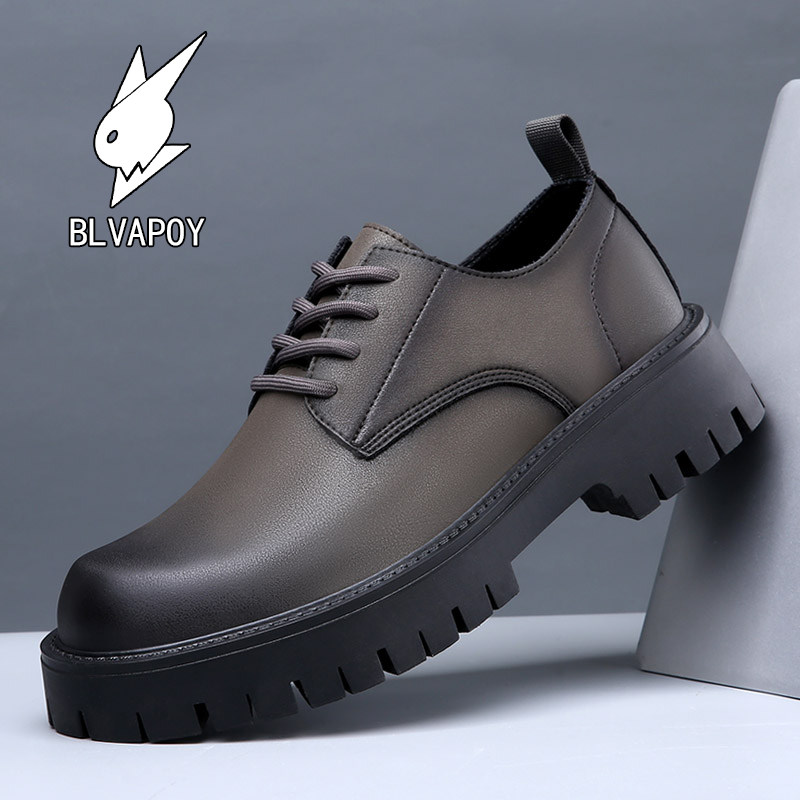 花花公子男士皮鞋低帮休闲鞋大头工装鞋英伦真皮厚底商务正装黑色