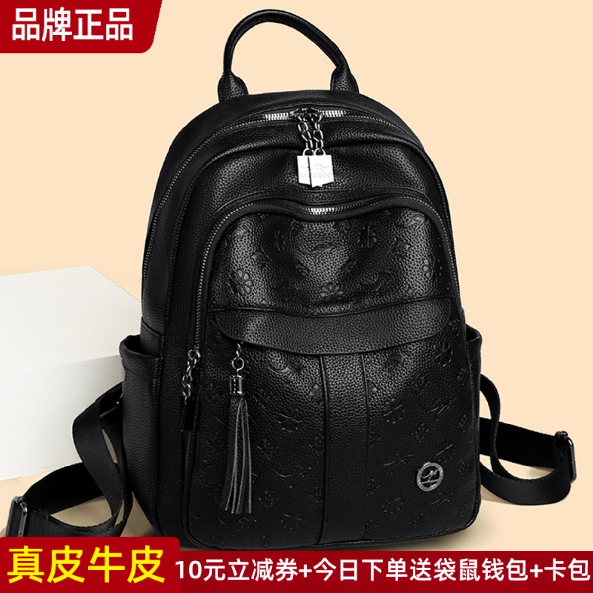 正品袋鼠真皮双肩包女2025新款旅行大容量女包软牛皮背包休闲百搭