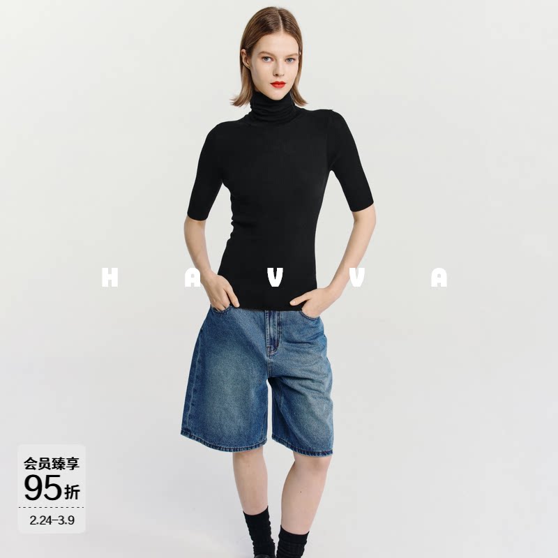 HAVVA高级感高领短袖针织衫毛衣修身打底衫女上衣2025秋冬M3-5083