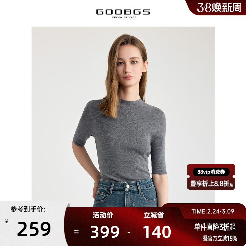 谷邦100绵羊毛短袖针织衫女2025秋季新款半高领修身显瘦毛衫上衣