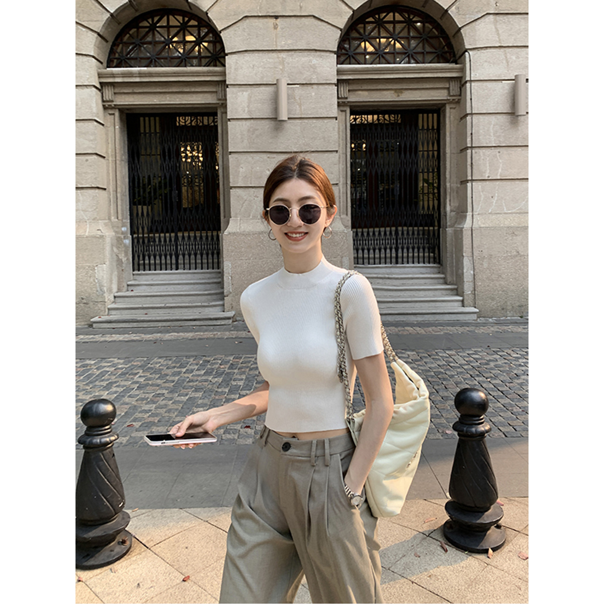 从那以后白色短袖半高领半袖内搭针织修身穿搭上衣新中式打底衫女