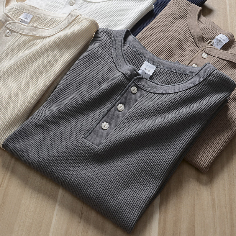 美式硬汉风针织华夫格面料亨利领长袖T恤男 秋冬日常百搭青年打底