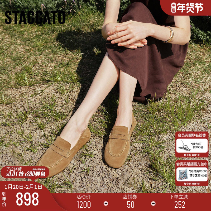 思加图2026新款棕色复古豆豆鞋平底鞋一脚蹬软底单鞋女鞋A9125AA6