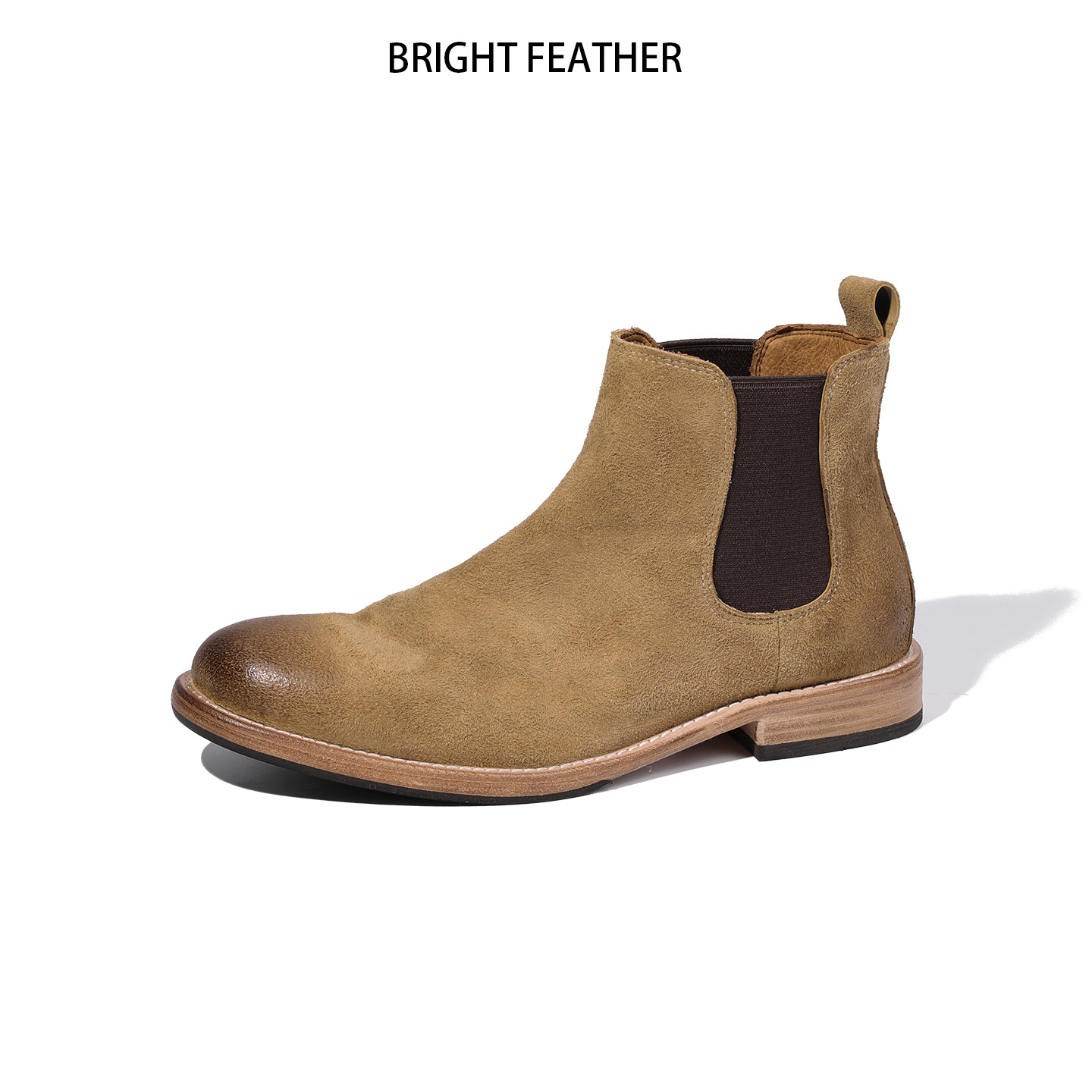 米色英伦风尖头切尔西靴男款真皮侧拉链反绒皮复古短靴高帮马丁靴
