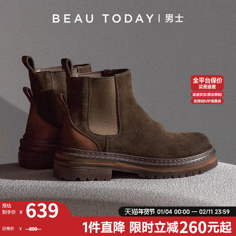 BeauToday复古切尔西靴男款冬反绒工装马丁靴子烟筒靴中高帮皮鞋