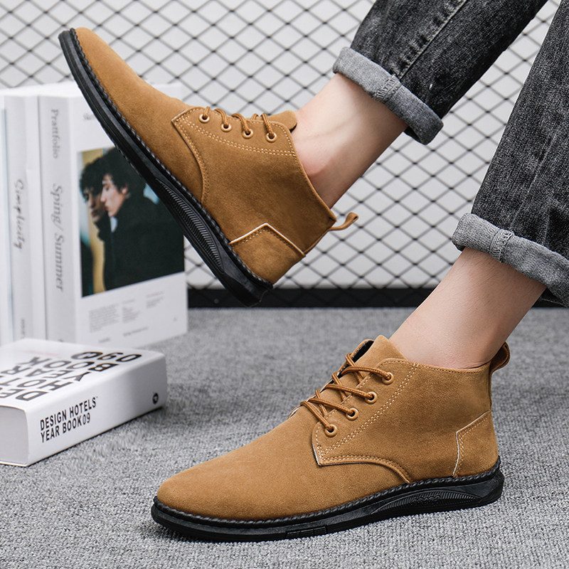 男款春季青少年黄棕色反绒皮翻毛皮高帮板鞋时尚英伦中帮休闲皮鞋