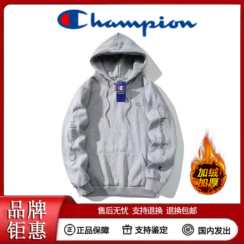 Champion冠军加绒套头卫衣秋冬男女情侣刺绣麒麟臂宽松连帽上衣潮