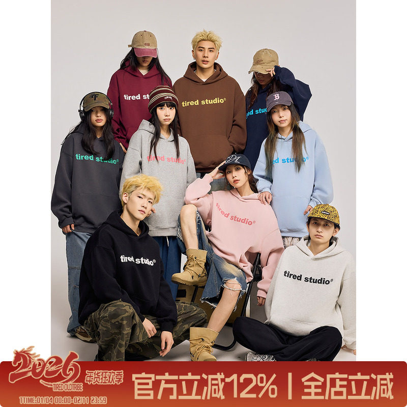 TIRED简约连帽卫衣男女长袖秋冬400g加绒情侣款宽松套头街头上衣