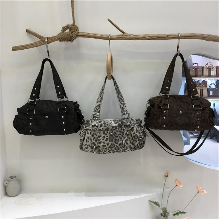 小脏柜 美式复古街头铆钉豹纹帆布包休闲百搭手提腋下斜挎托特包