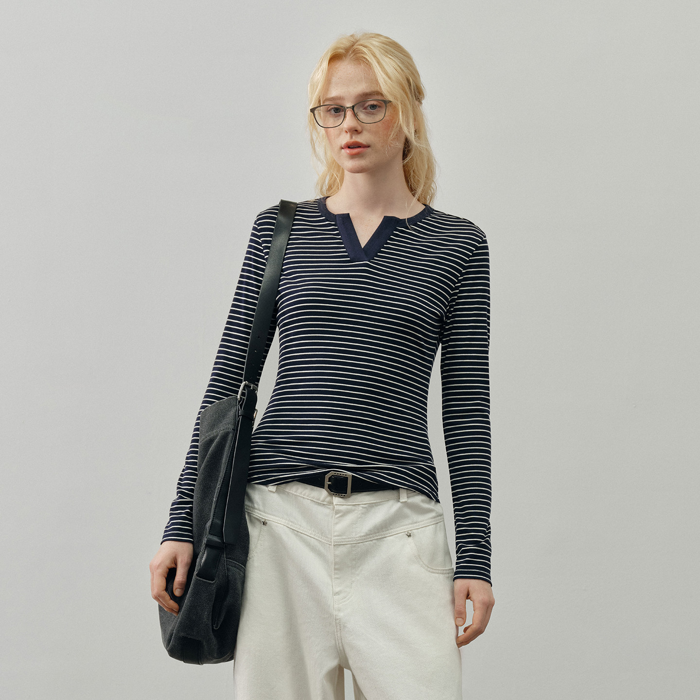 PSO Brand女装条纹撞色V领休闲女士长袖上衣修身显瘦黑色t恤潮牌
