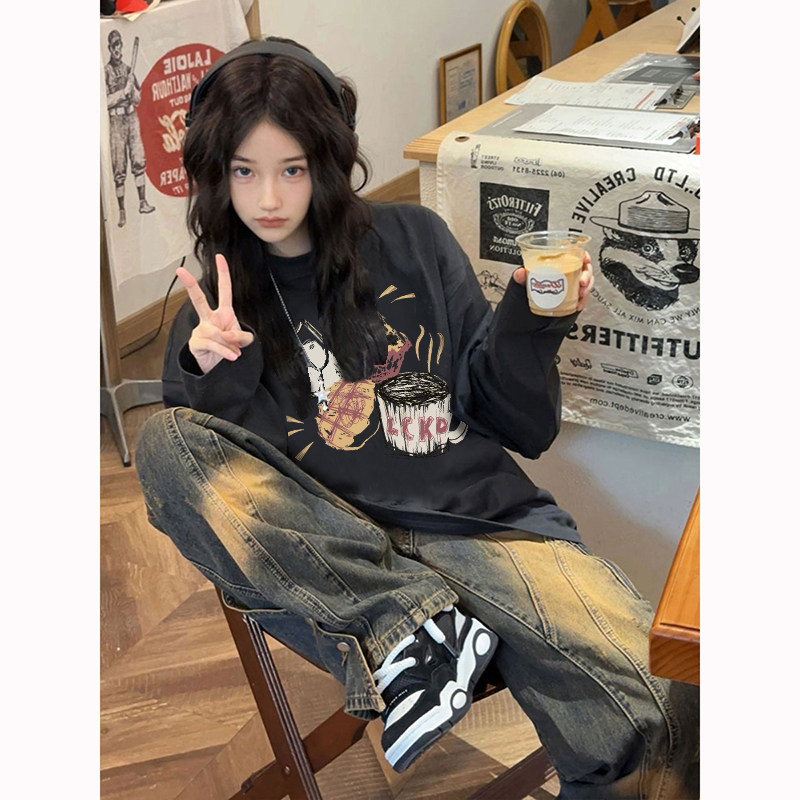 潮牌美式卡通黑色圆领长袖t恤女宽松oversize慵懒风2025春秋新款