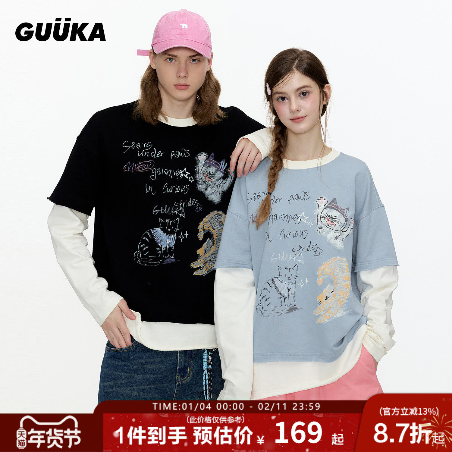 双高胎同款GUUKA潮牌黑色猫咪长袖T恤男重磅纯棉假两件上衣女宽松