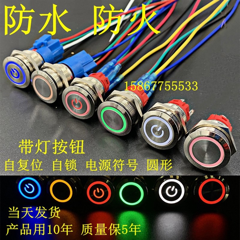 金属按钮开关自锁自复位防水小型圆形led带电源灯车12/16/19/22mm