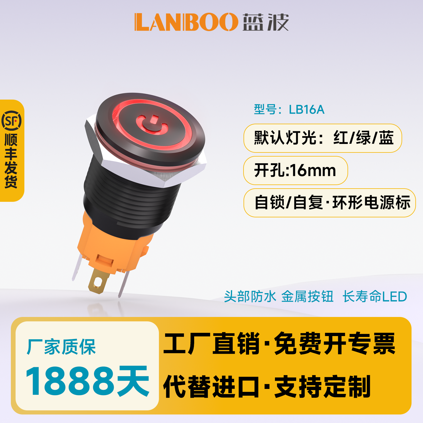 蓝波16A2平头防水金属按钮开关16mm自锁复位环形DIY带灯24V220V