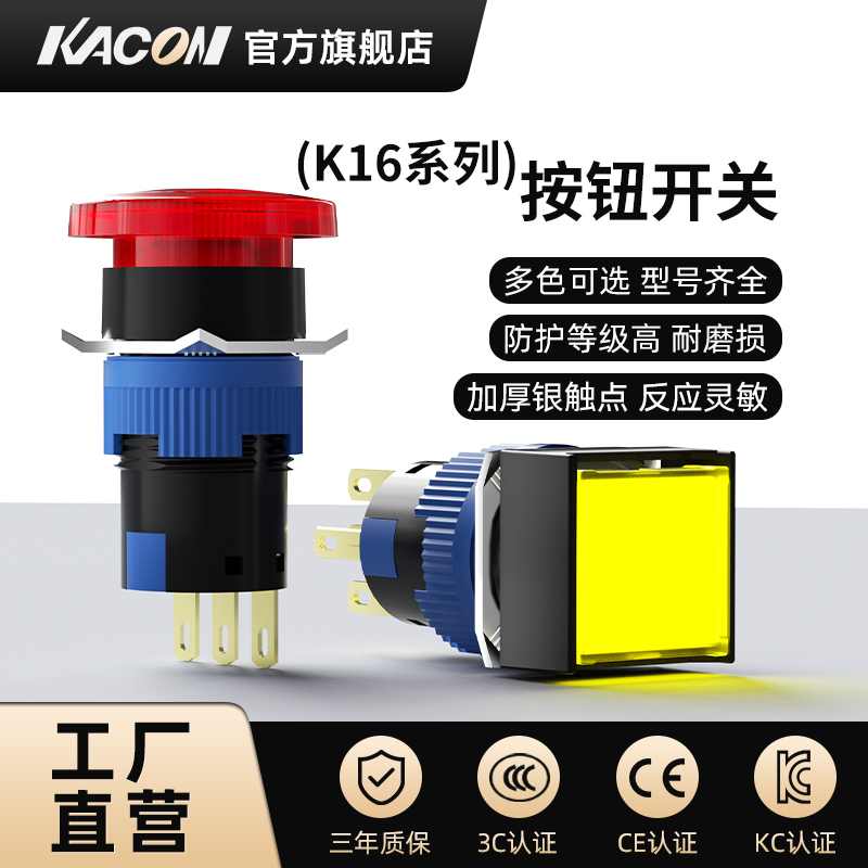 凯昆KACON按钮开关16mm小型急停启动电源带LED灯自复位按压式 K16