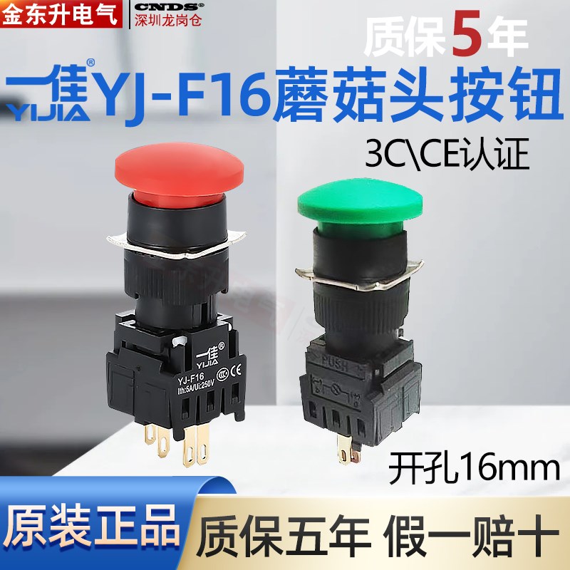 一佳分体按钮开关YJ-F16-11M/ZS蘑菇头自复位自锁按钮开关16mm