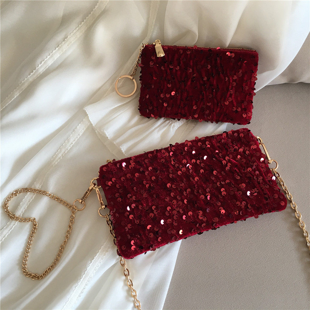 手机包新款流光亮片钱包女丝绒单肩包拉链手拿包百搭链条斜挎包潮