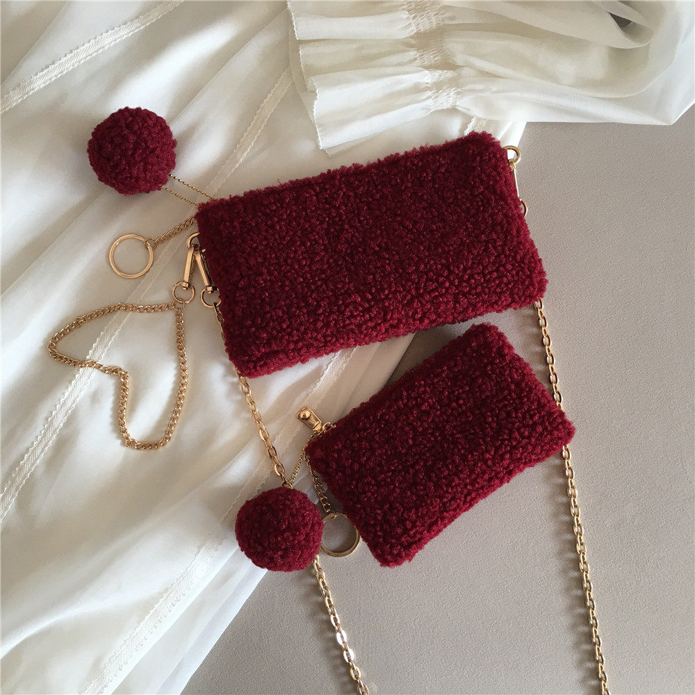 手机包新款钱包女式手拿包复古红色毛毛化妆包百搭链条单肩斜挎包