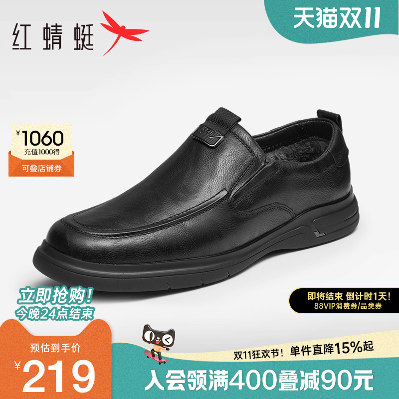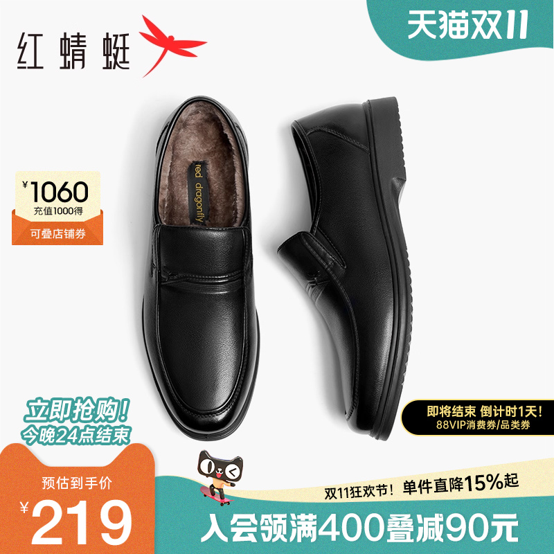 红蜻蜓男士加绒皮鞋冬季一脚蹬男鞋真皮保暖中老年人鞋子爸爸棉鞋