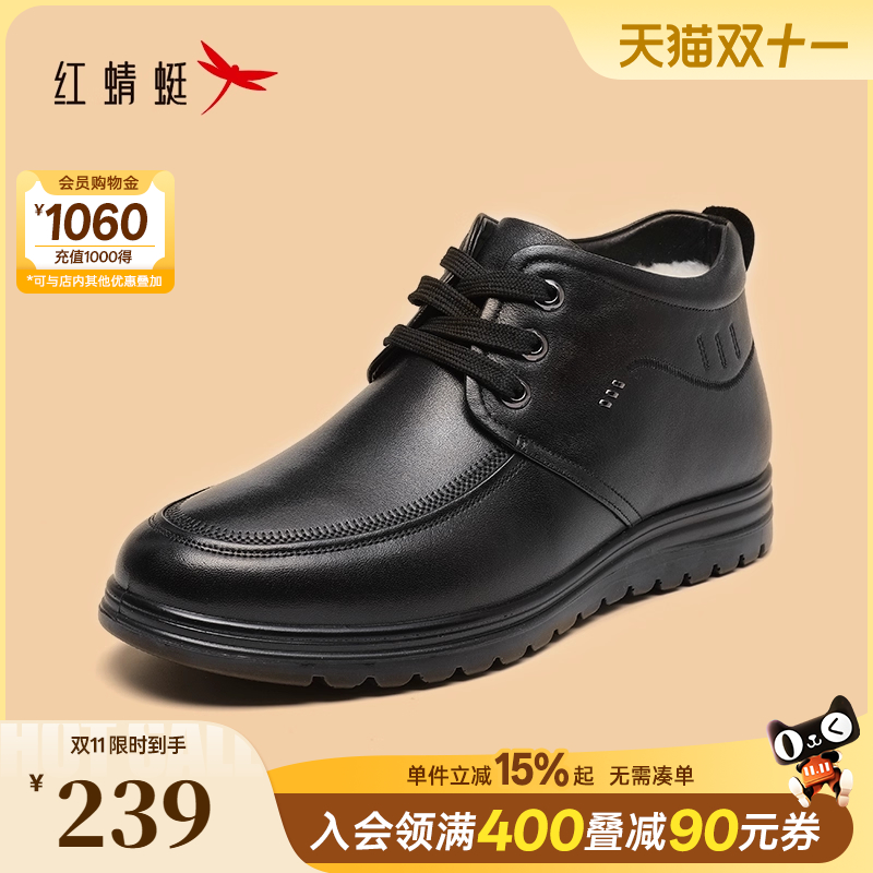 红蜻蜓男士皮鞋冬季新款加绒保暖休闲男鞋真皮中老年棉鞋爸爸鞋子