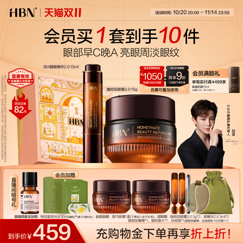【双11现货】HBN眼部套装CP咖啡因眼霜双A醇眼精华视黄醇淡纹提亮