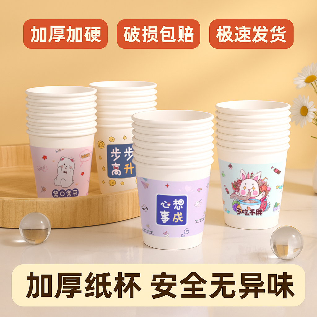 100只一次性纸杯加厚家用商用茶水杯子奶茶杯加硬马年特厚品尝杯