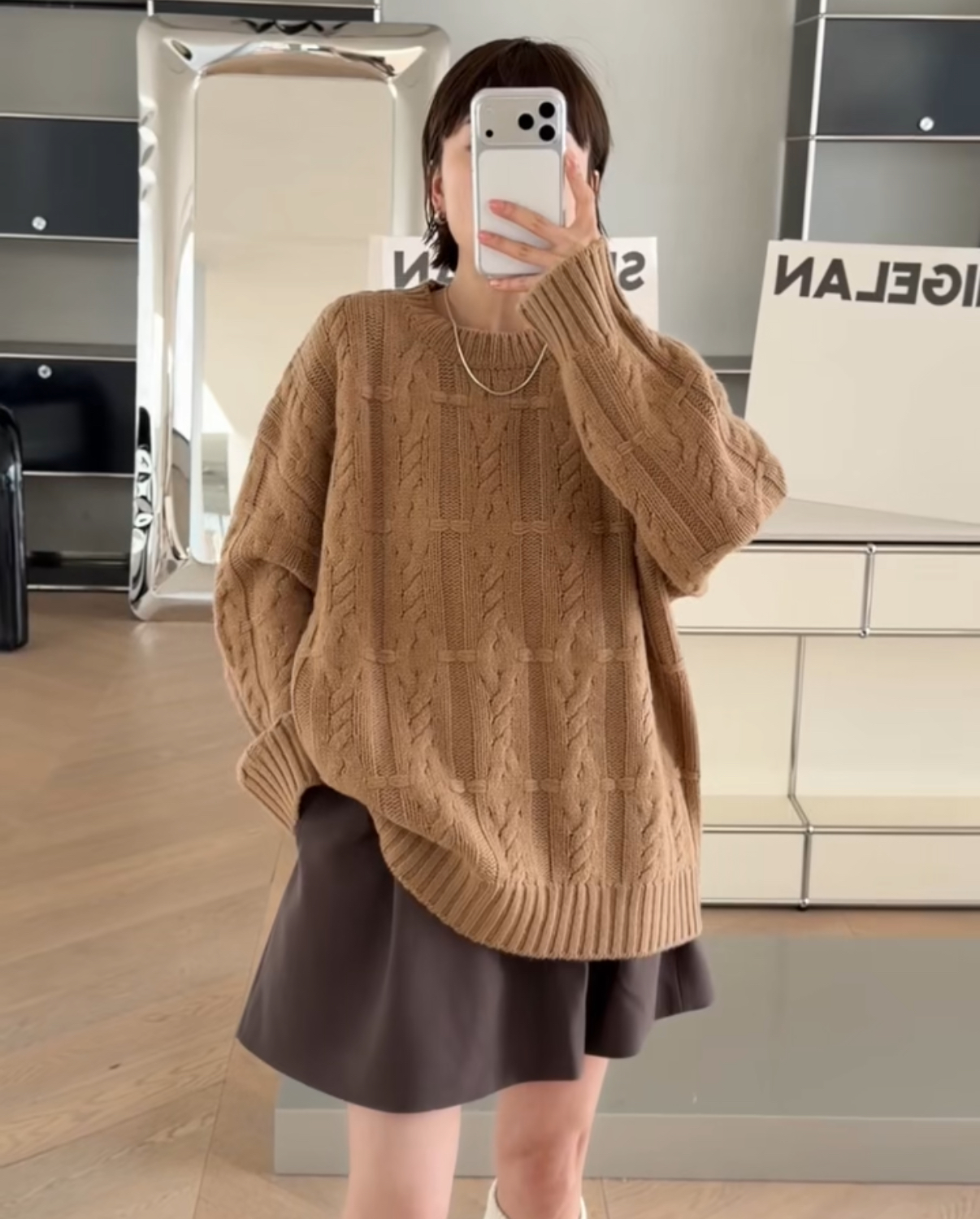 妍西家 诗歌兰女装25冬款88601时尚百搭驼色圆领麻花纹宽松毛衣女