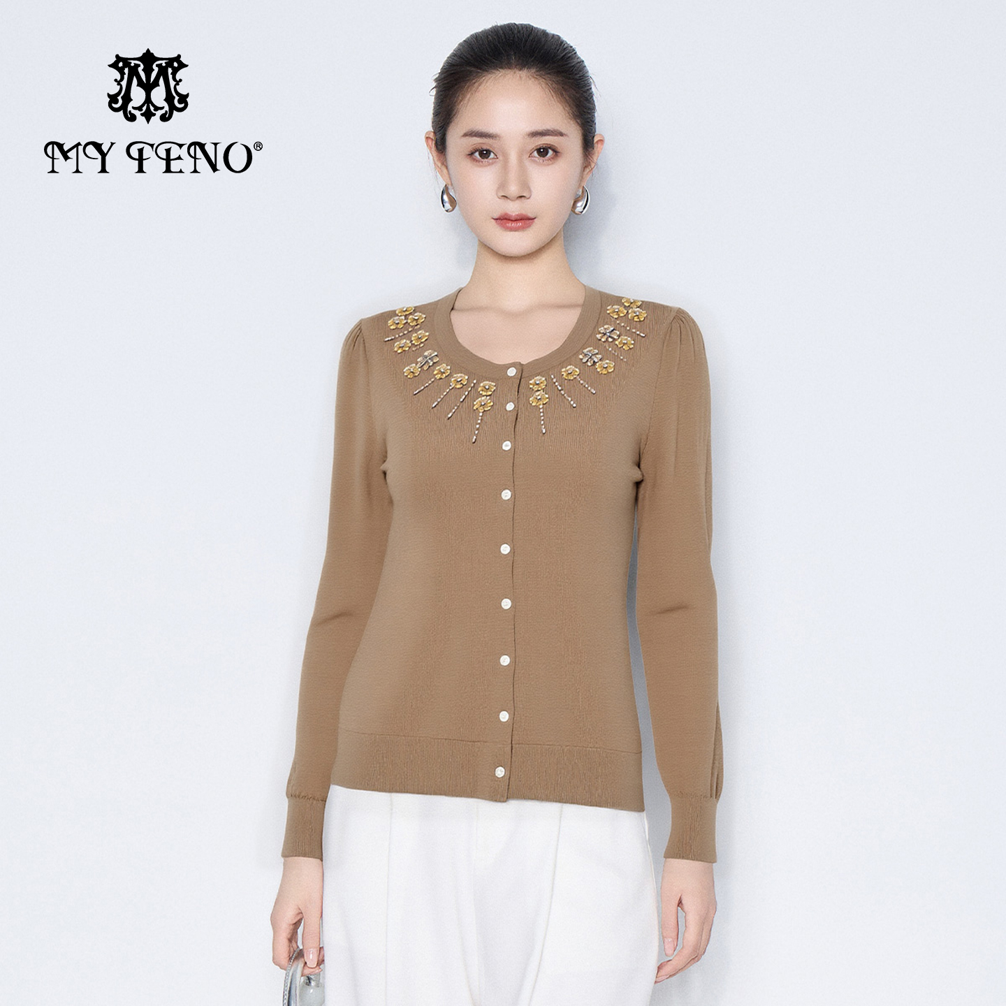 马天奴2025秋冬新款驼色钉珠圆领单排扣绵羊毛针织开衫毛衫气质女