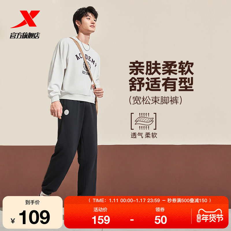 特步休闲裤男女同款长裤春秋季针织运动裤宽松黑色休闲裤收脚卫裤
